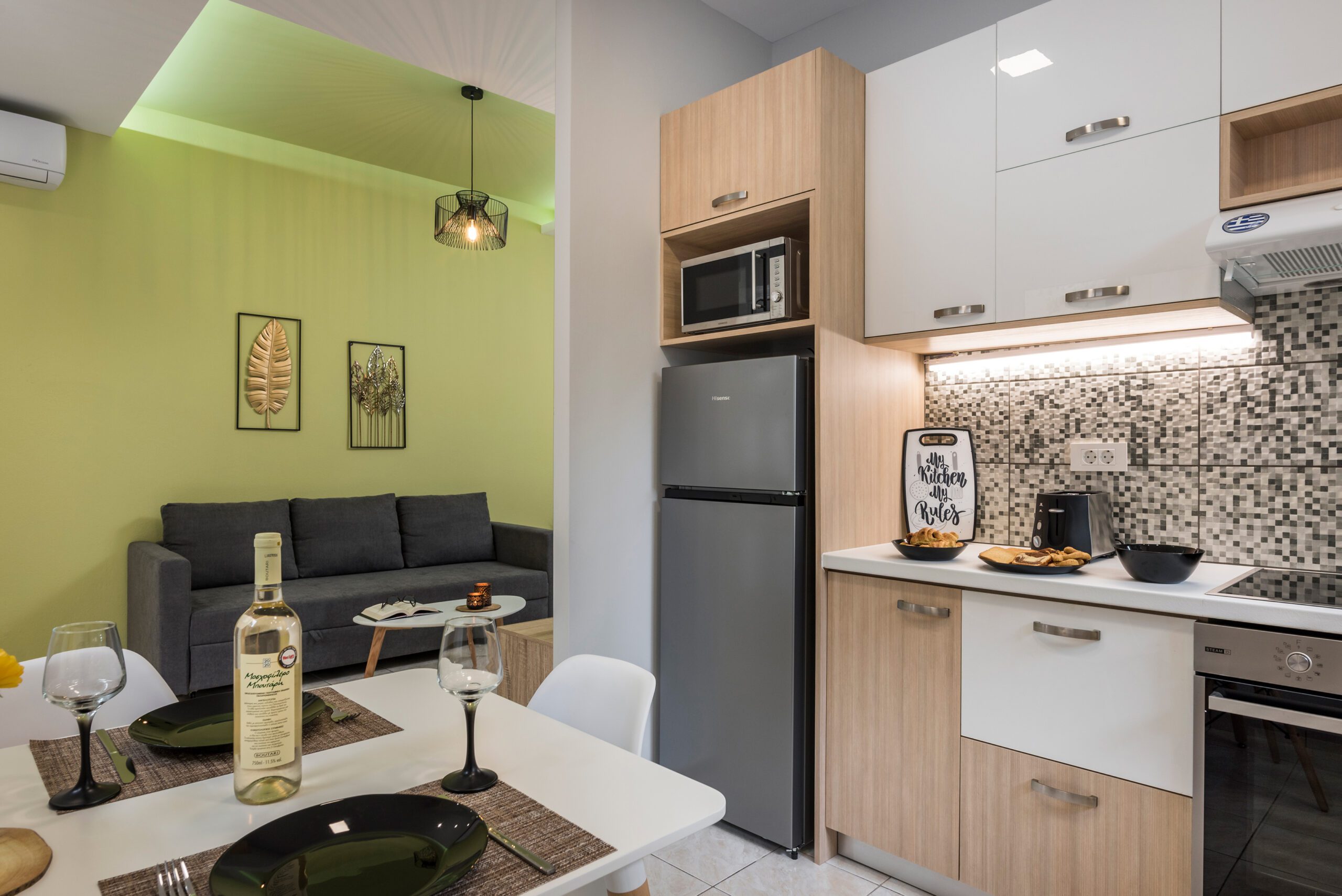 The apartment is located on the ground floor of the building and extends to 44 sqm with garden & pool view through the window. It can accommodate up to 4 people as it has 1 bedroom, equipped with a double bed and two more people can sleep on a sofa bed if necessary. The bedroom has a wardrobe, bedside tables, TV, and air conditioning. The apartment has 1 bathroom. You will also find an open space area in the living room where there is a TV, and a fully equipped kitchen with all electrical appliances which will facilitate your stay such as oven, refrigerator, filter coffee maker, toaster, microwave etc. The open space has air conditioning. In the outdoor area, you will find a communal pool and pool towels as well as a shared patio. However, all apartments have private balconies.