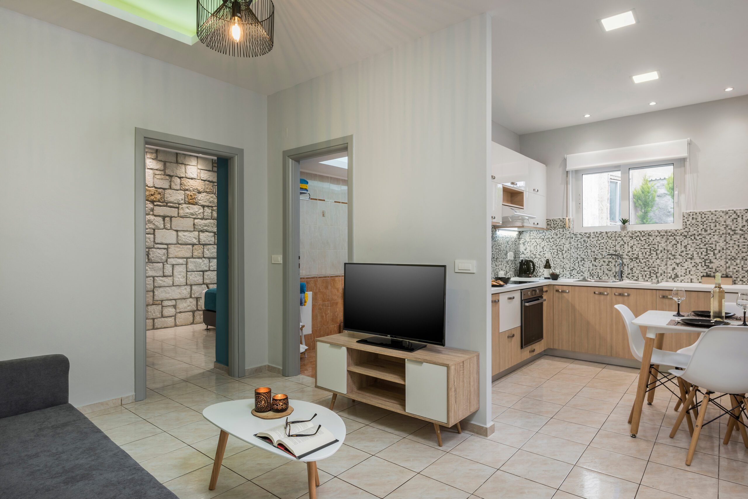 The apartment is located on the ground floor of the building and extends to 58 sqm. It can accommodate up to 6 people as it has 2 bedrooms, each equipped with a double bed, and two more people can sleep on a sofa bed if necessary.